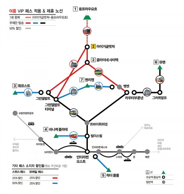 적용 노선: 인터라켄 ~ 융프라우요흐 구간 50% 할인 + 베르너 오버란트 지역 내 교통 무료