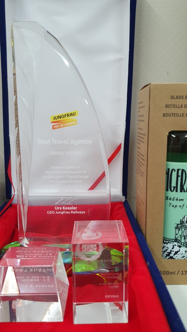 작년에는 융프라우에서 베스트 파트너를 국내 대표 여행사와 카페등 19개회사만 표창(더 적었나 기억이 잘 안나네요 ~~ )했는데 트래블시스템도 선정되어, 국내 굴지의 회사들과 함께 상패를 받았습니다. 항상 좋은 정보를 소개하는데 최선을 다하겠습니다.